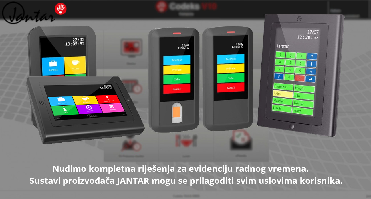 "Uvođenjem sustava evidencije radnog vremena povećava se produktivnost djelatnika kao i učinkovitost rada." Ovdje radimo s opremom slovenskog proizvođača Jantar kao i njemačkog proizvođača Kaba.